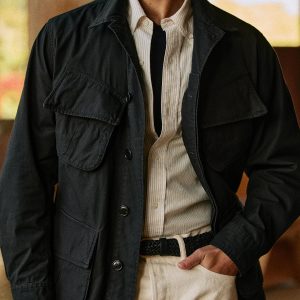 The Flyers Jacket draws inspiration from the late 1940s U.S. Navy Summer Flight Jacket, adapted with a distinct four-pocket design. It features a shawl collar and cuffed sleeves with vented button closures, offering a tailored alternative to the original tubular sleeves. Cut from a sturdy cotton and nylon blend with a Durable Water Repellent finish.