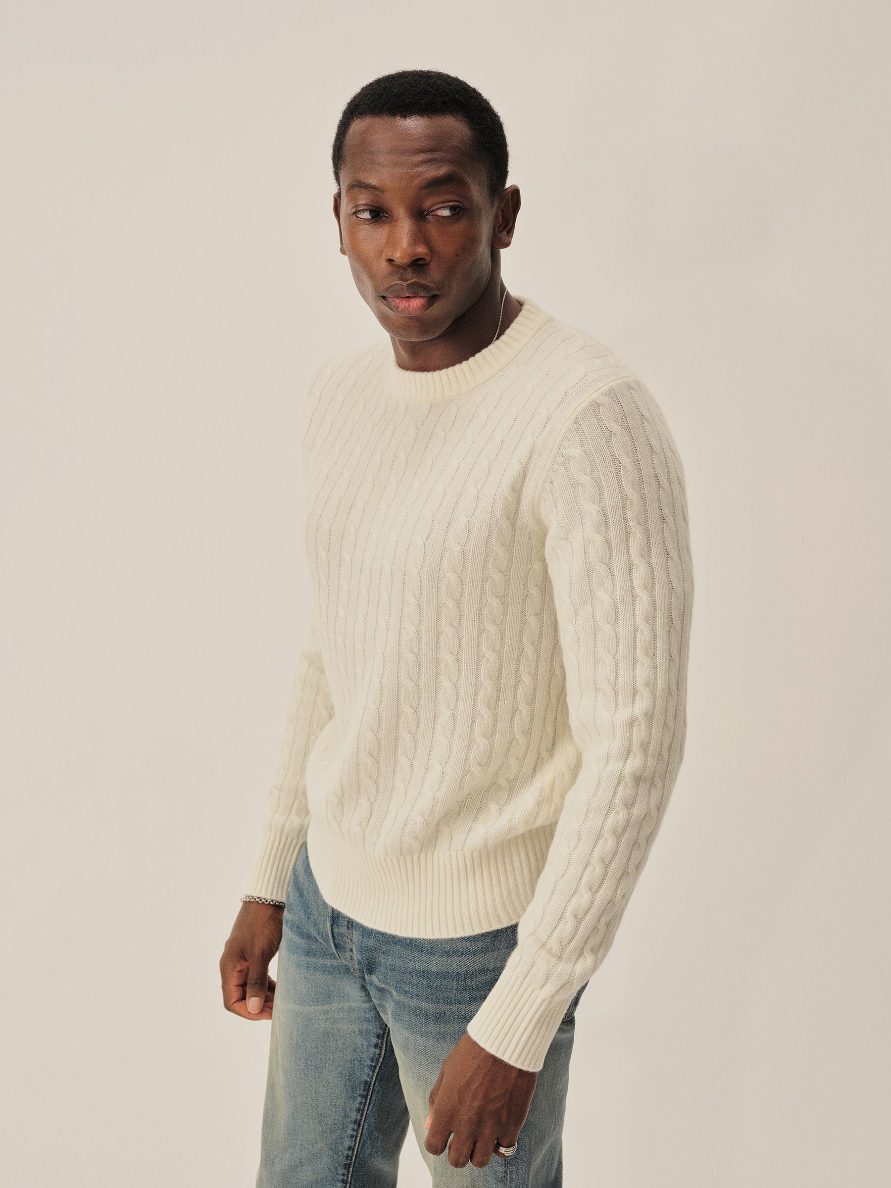 The California Cashmere Cable Crew is spun from 100% long-staple cashmere and knit in a refined 12-gauge cable pattern. Inspired by the casual poise of 1960s Ivy League sweaters, it’s finished with yarn-dyed ribbing at the neck, cuffs, and hem, and garment-rinsed for a soft, lived-in feel.