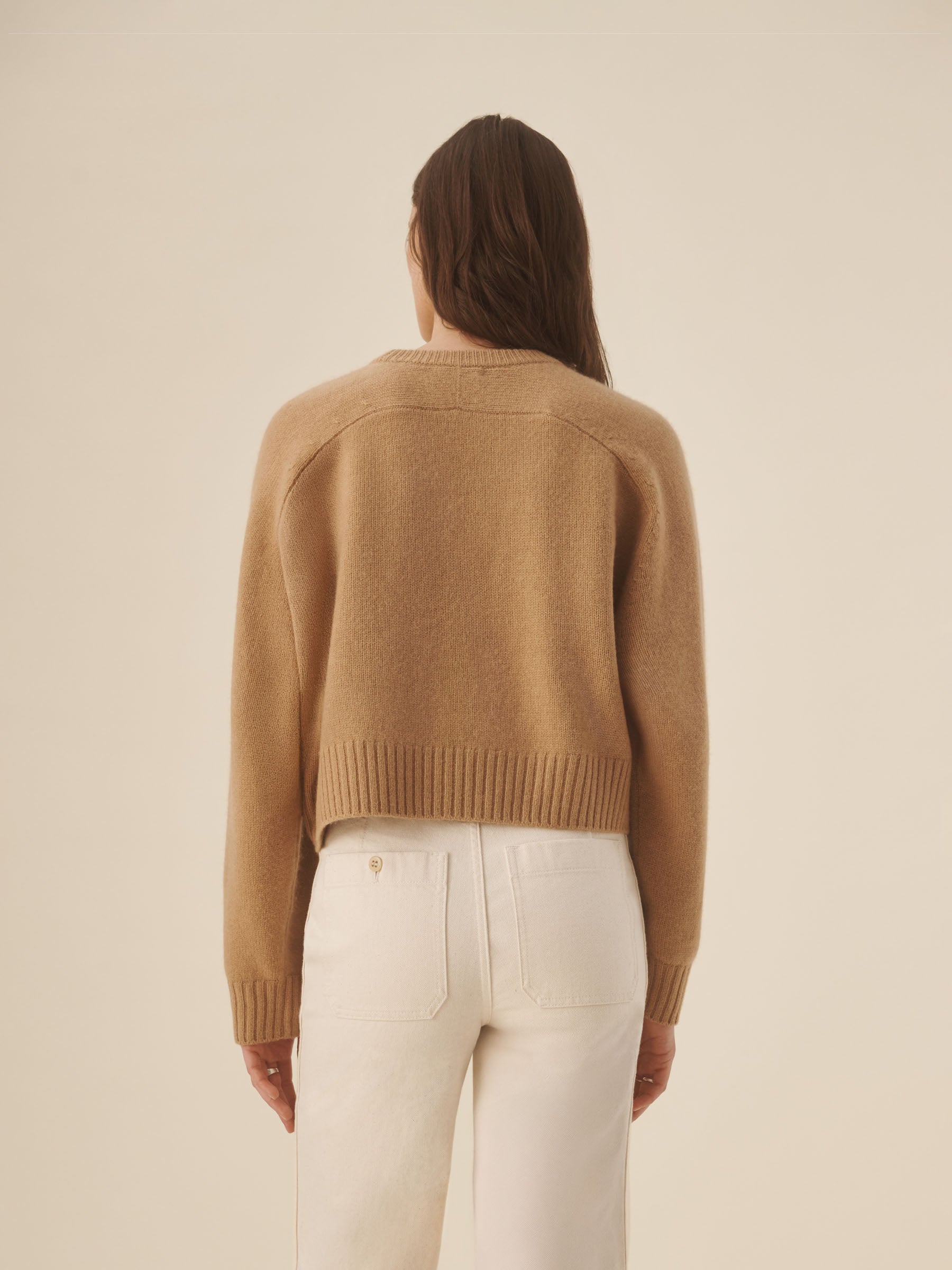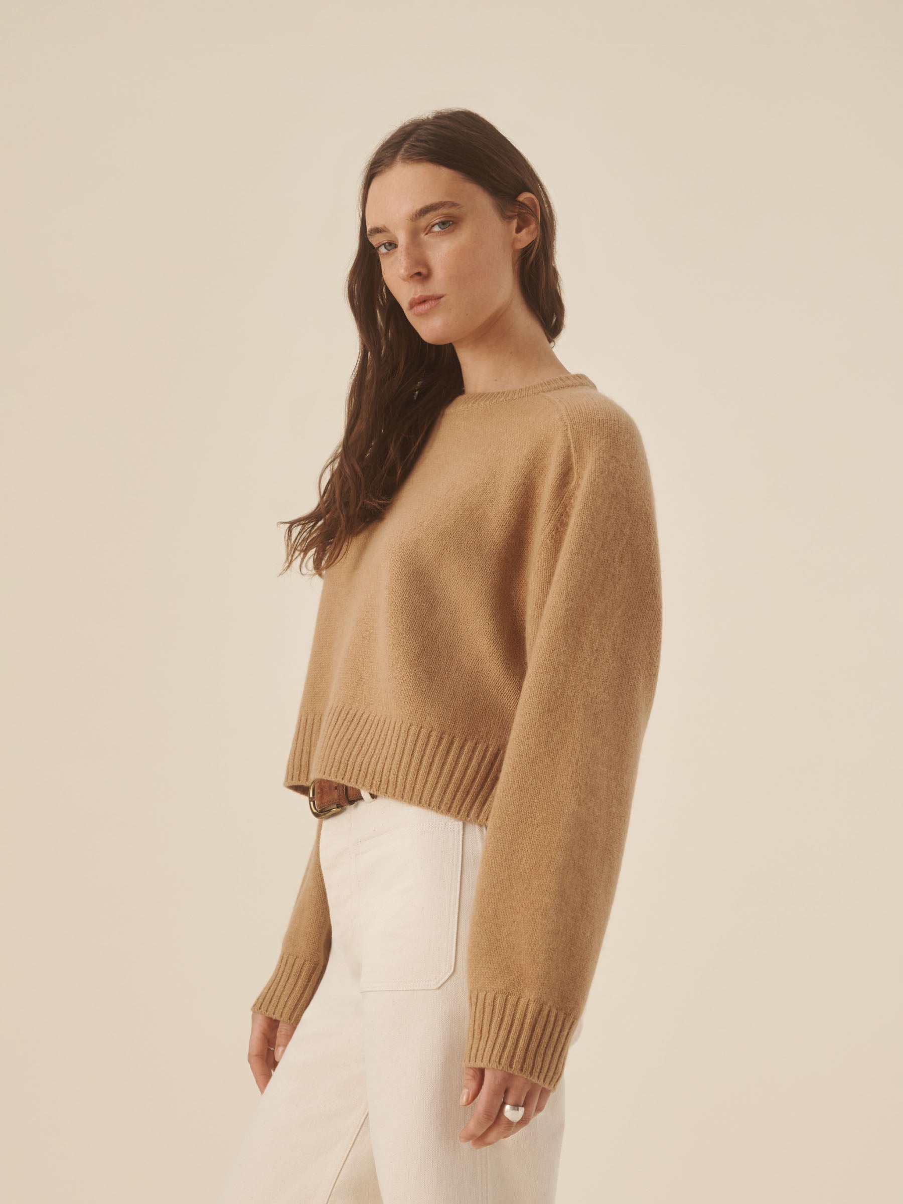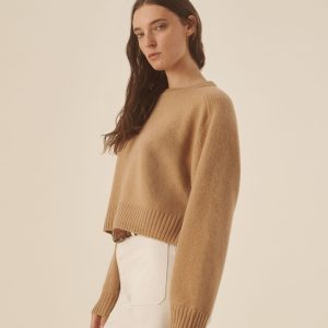 A cozy crewneck crafted from 100% cashmere in a soft jersey stitch. Designed with a boxy, oversized silhouette and saddle-shaped armholes, and finished with ribbed trims at the neckline, cuffs, and hem.