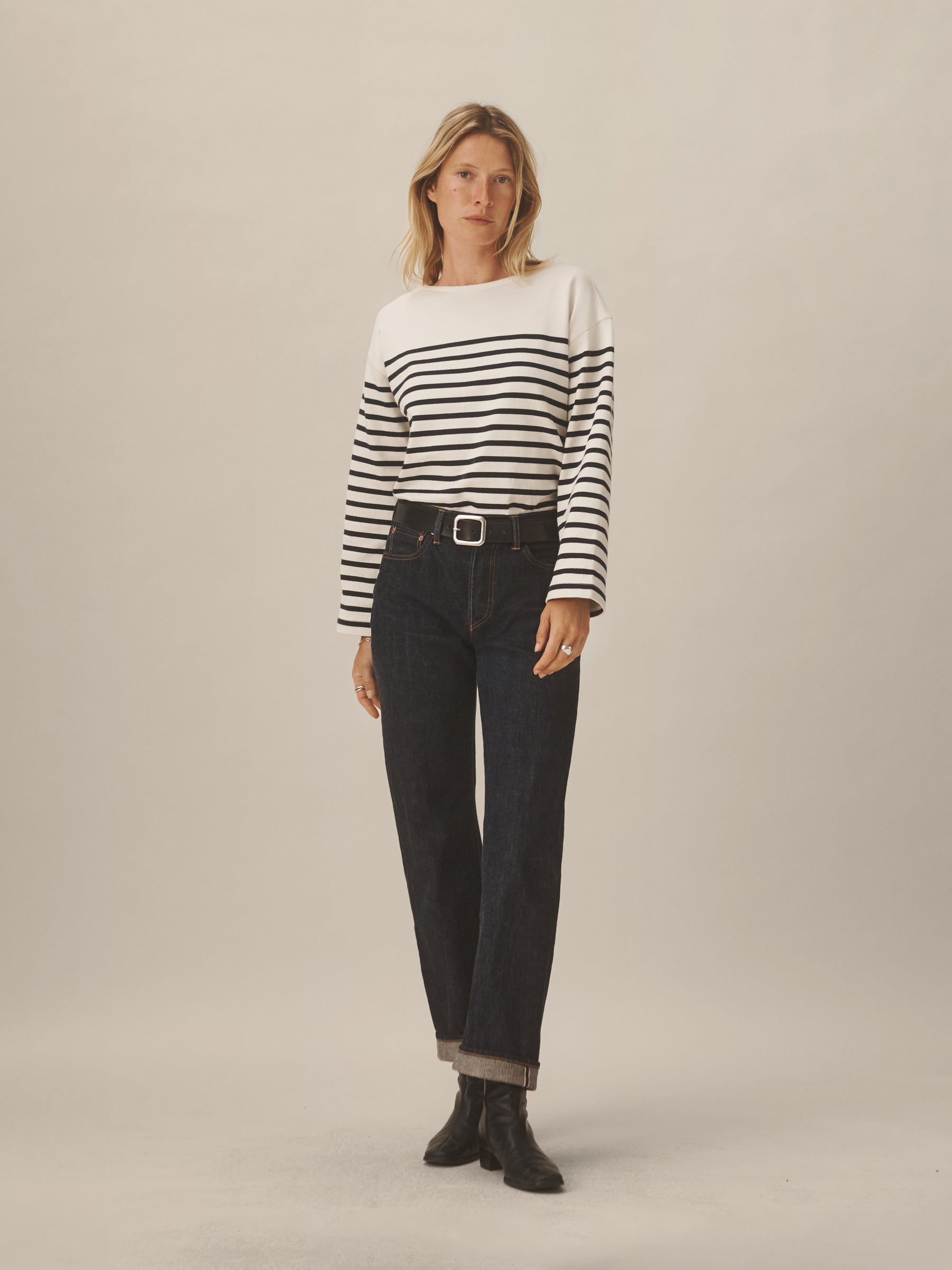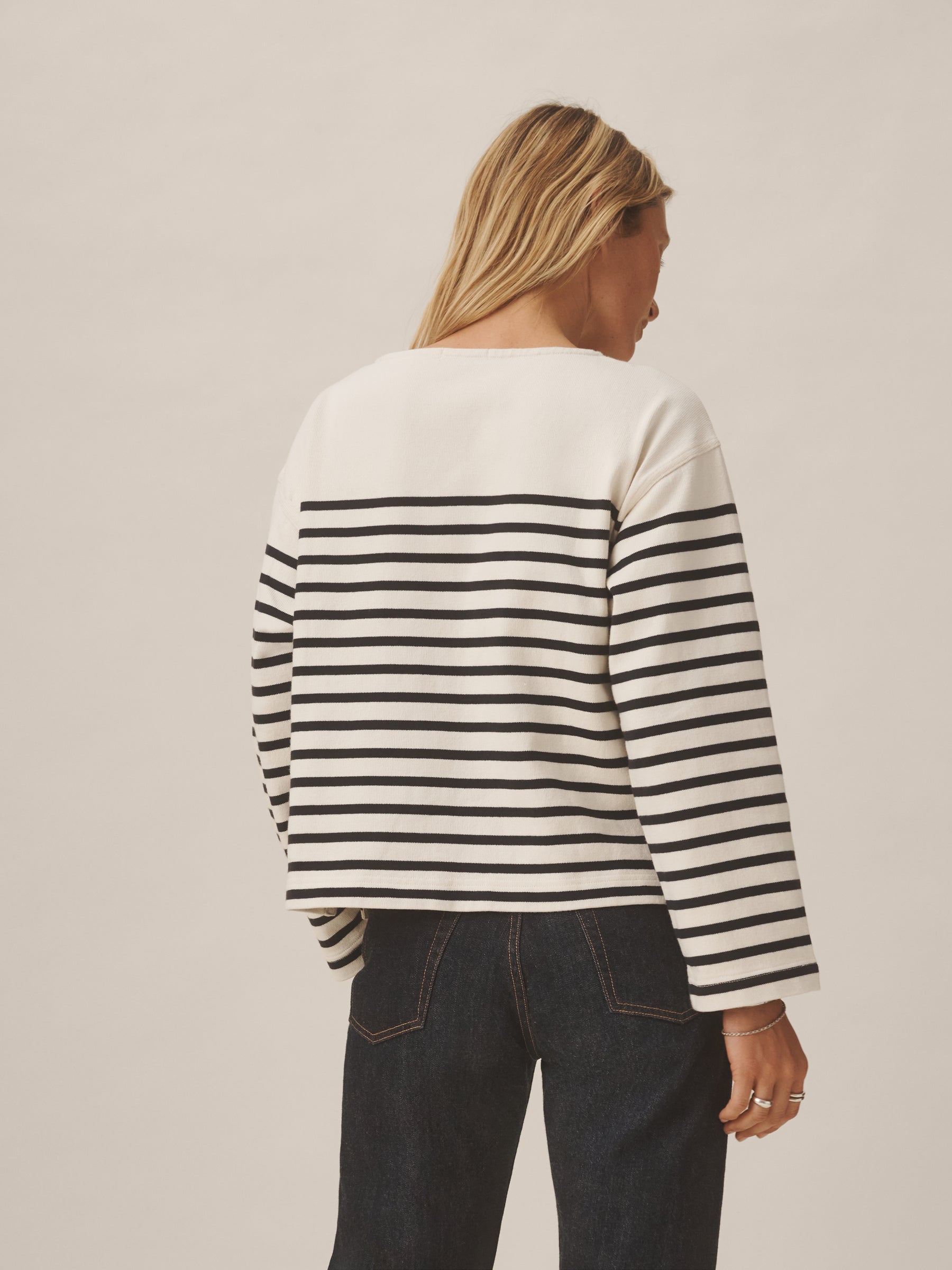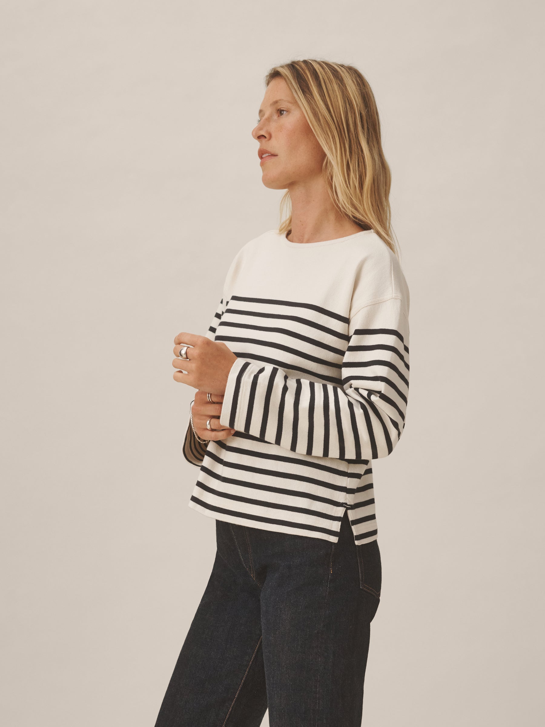 Relaxed long sleeve boatneck tee inspired by the classic French breton shirts. Cut from sturdy, compact 350 GSM cotton. Details include a taped boatneck neckline and side slits at the hem. Constructed with flatlock stitching throughout and double needle coverstitching at the hem. Garment washed for a lived-in feel.