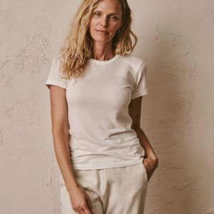Slim fit crewneck tee cut from a supersoft 130 GSM blend of bamboo, cotton, and wool. Features a straight hem, a self bound neck, and raised armholes that hug the contours of the shoulders. Garment washed for a lived-in feel.