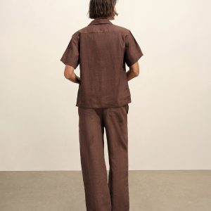 Oversized short-sleeve camp collar shirt with a cropped body, cut from a 100% linen weave. Featuring a low neckline, two front chest pockets, notched vents at sides, and a back yoke to box pleat. Finished with oversized mother of pearl buttons for a luxe, polished summer look. Garment washed for a lived-in look and feel.