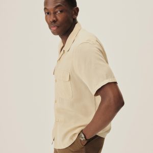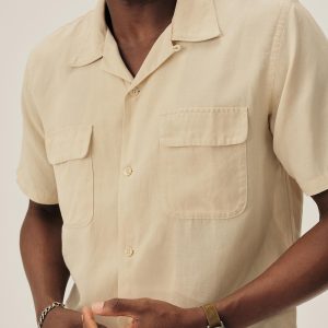 Classic fit short sleeve camp shirt cut from a 5.25 oz. yarn-dyed linen blend with a subtle luster and relaxed drape. Features a six-button placket with mother of pearl buttons, twin patch-and-flap chest pockets, straight hem, and a loop and button closure at the neck. Constructed with clean finished seams. Garment washed with enzymes for a lived-in feel.