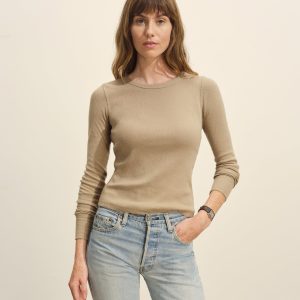 Slim fit crewneck sweater in a 24″” length, elevated in a 14 gauge variegated rib knit from a blend of merino wool, silk, and cashmere. Luxe, easy, and ideal for layering. Constructed with self-starting hem and sleeve trim and fashioning at the neckline and back shoulder for durability.