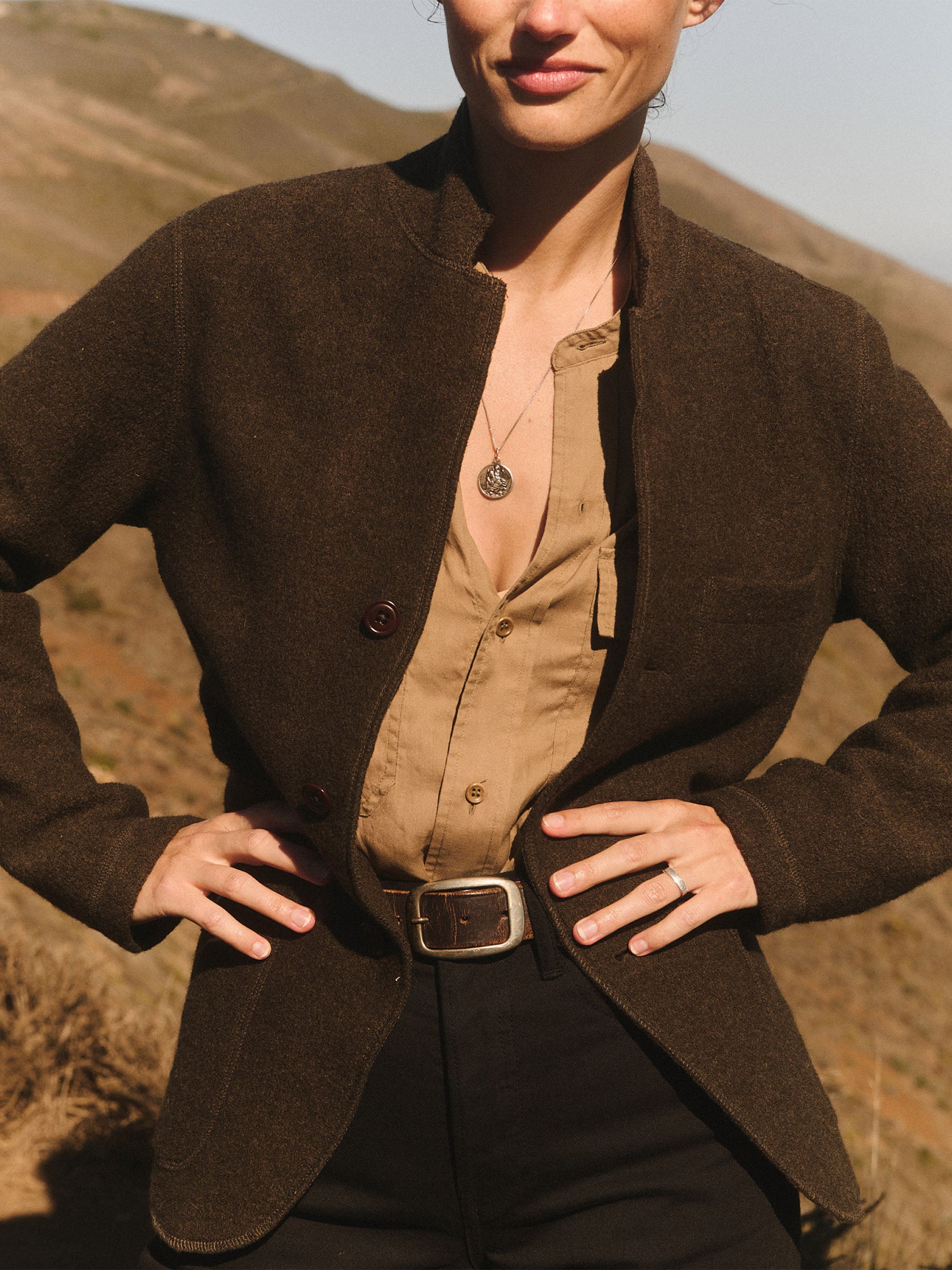 Classic fit chore coat with a slimmer cut through the arms and room in the torso for layering. This 340 GSM felted merino wool has been twice boiled for improved insulation and durability. Details include three patch pockets, horn buttons, and a notch collar. Constructed with hand-sewn facings and coverstitching throughout.