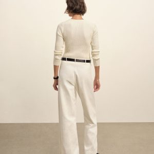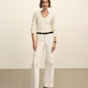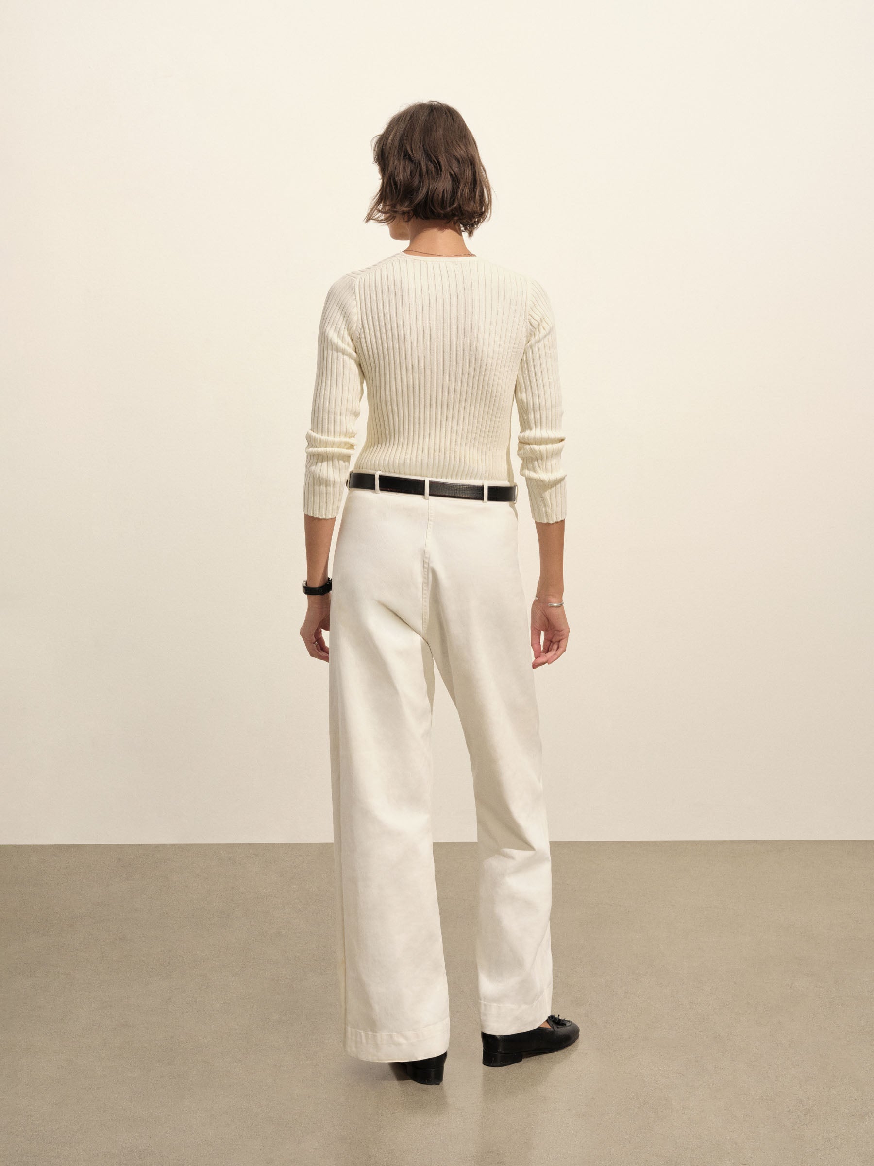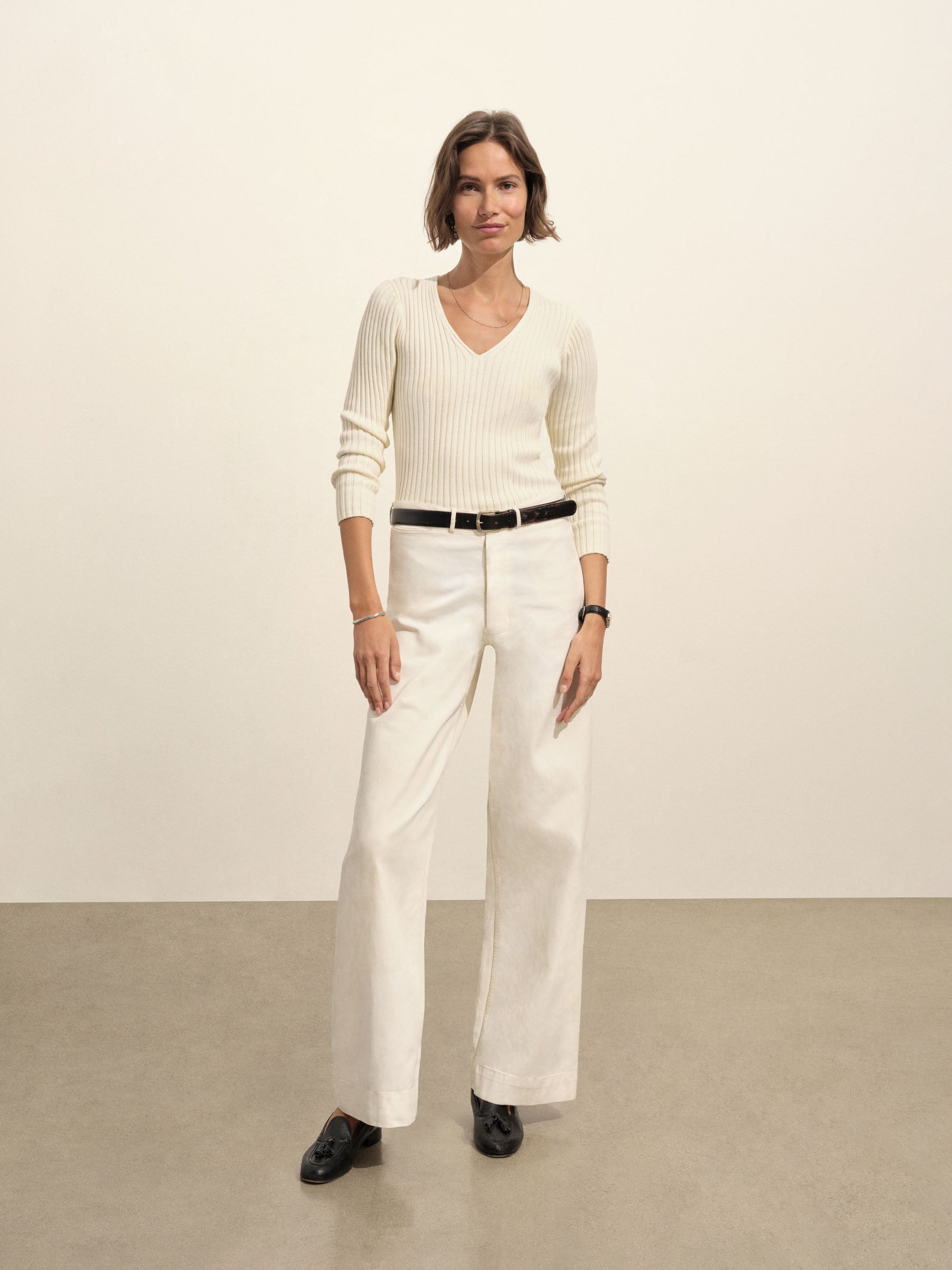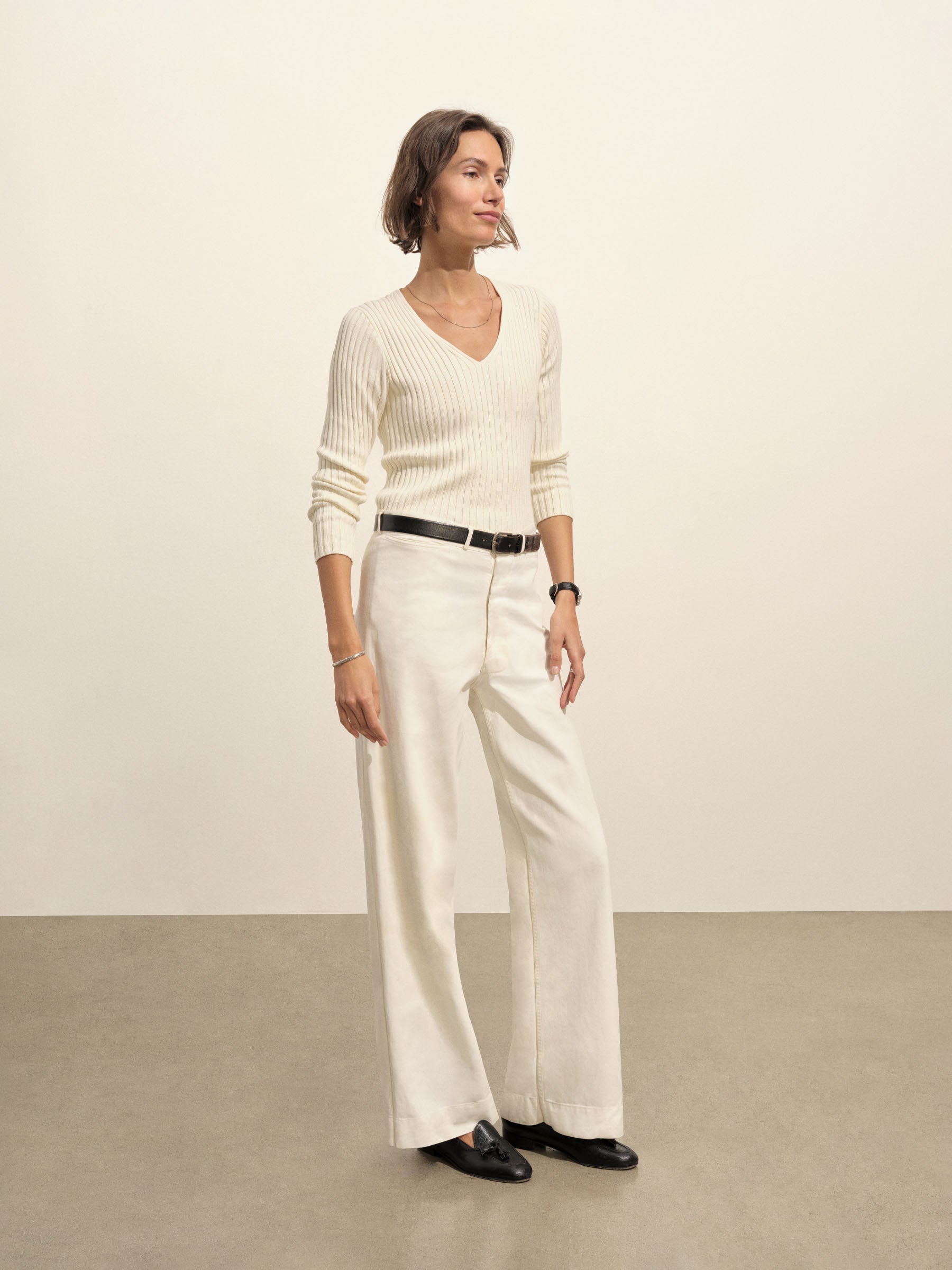 A vintage-inspired V-neck sweater with bracelet-length sleeves, crafted from premium Italian cotton yarn with a 3×3 ribbed structure for added stretch and a snug, flattering fit. Garment-washed for a truly authentic, worn-in feel.