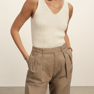 Slim-fit, vintage-inspired V-neck tank crafted from 100% Italian cotton yarn with a 3×3 deep rib structure. Designed with concealed chain threads and snaps beneath each shoulder to keep bra straps in place. Garment washed for a truly vintage, broken-in feel.
