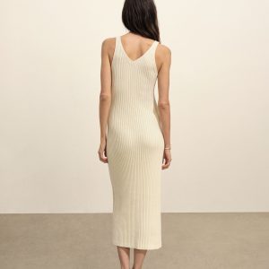 Slim-fit, vintage-inspired, 51” V-neck tank dress crafted from 100% Italian cotton yarn with a 3×3 deep rib structure. Designed with concealed chain threads and snaps beneath each shoulder to keep bra straps in place. Garment washed for a truly vintage, broken-in feel.