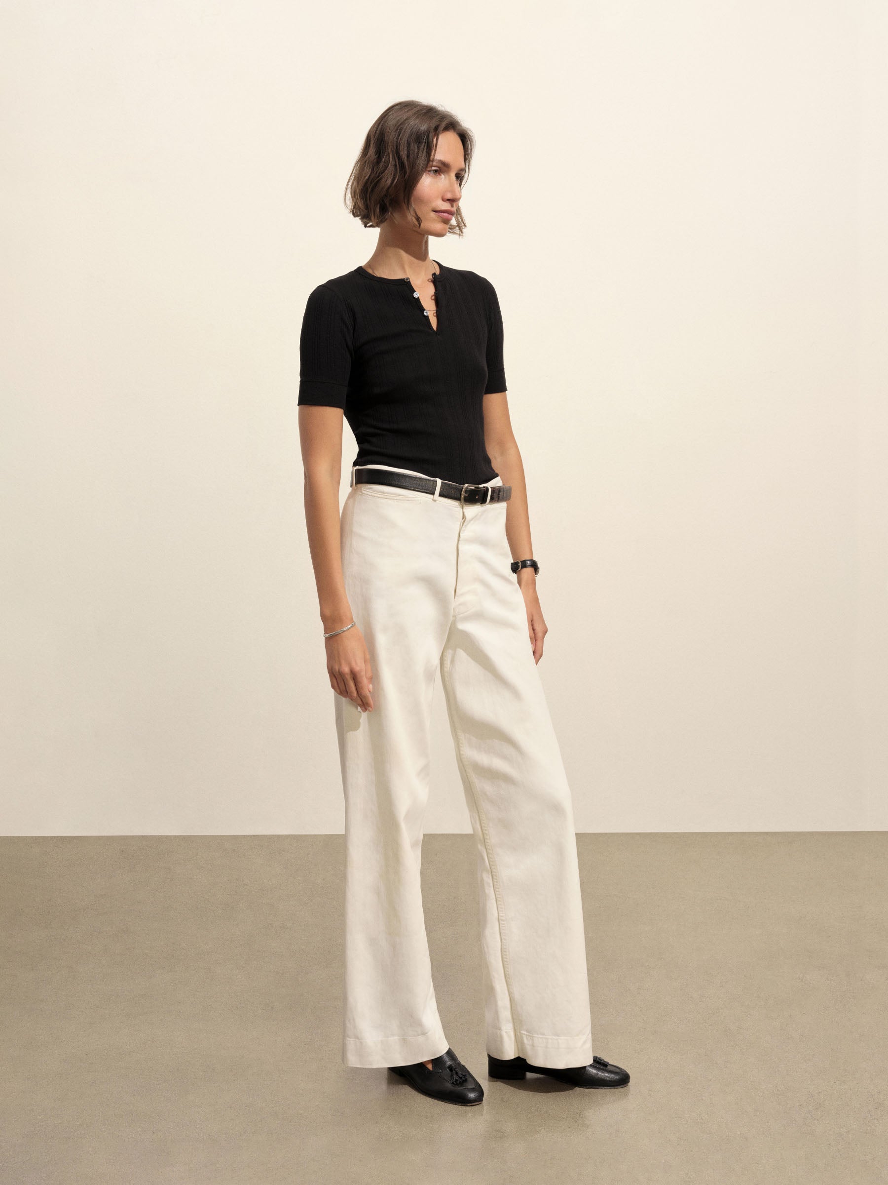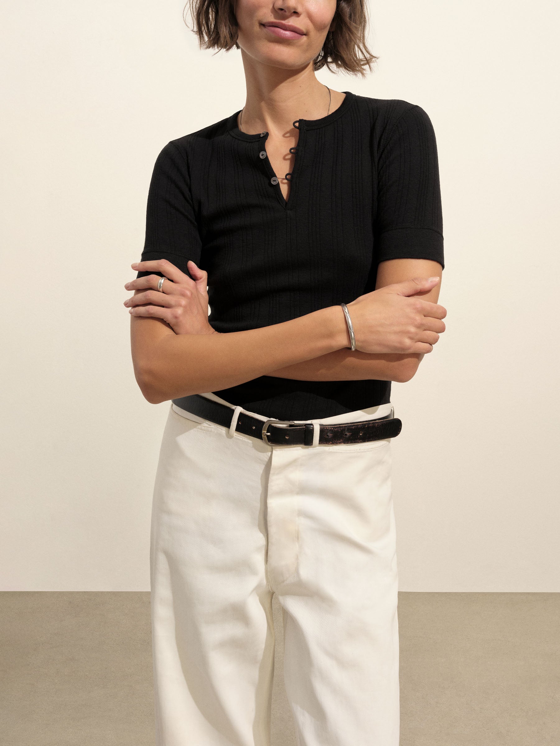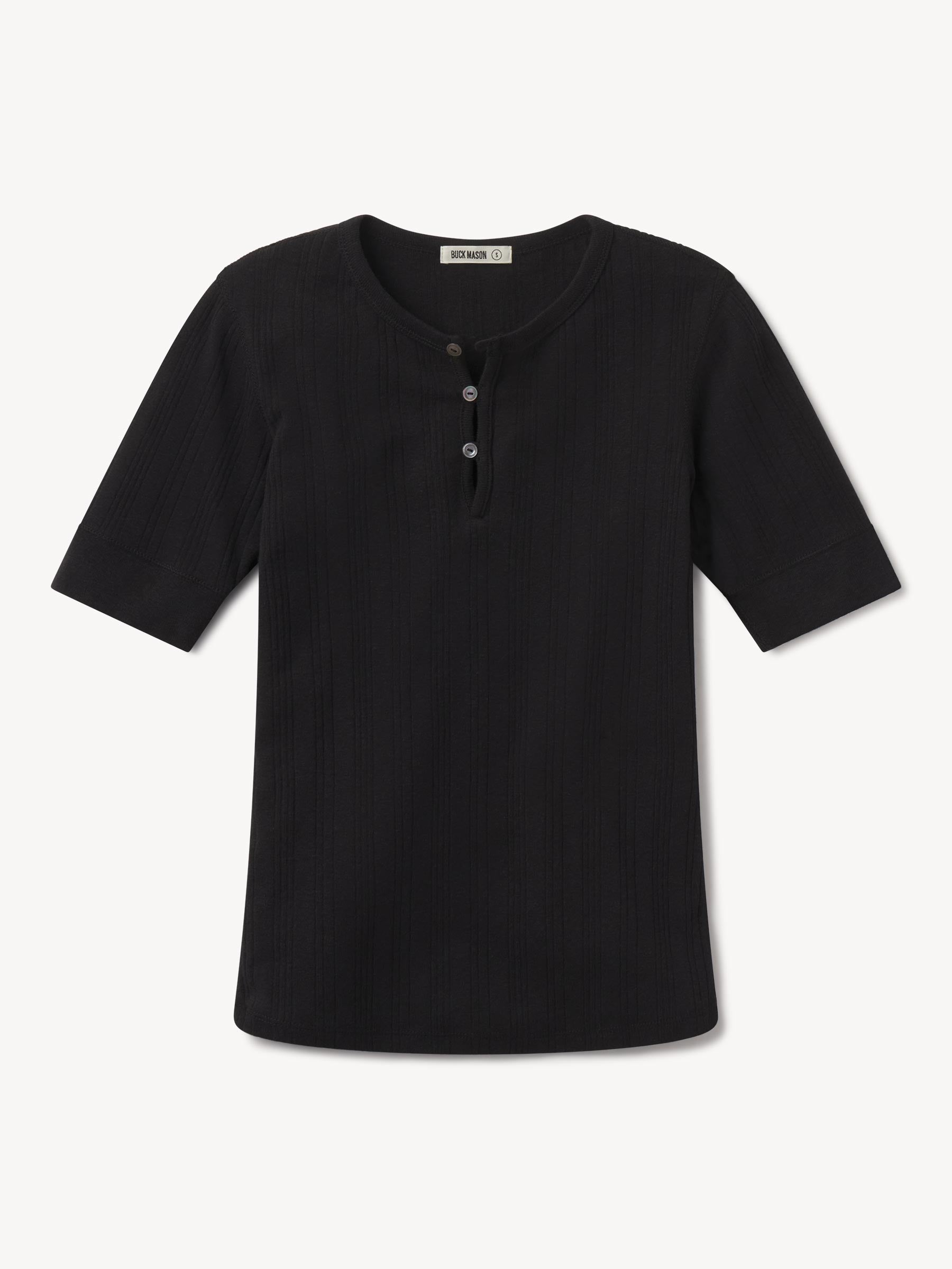 Military-inspired short sleeve henley, crafted from a superfine blend of new and recycled cotton with a subtle, textured rib. Featuring a three-button loop placket and sleeve cuffs. Finished with mother of pearl buttons and garment washed for a lived-in feel.