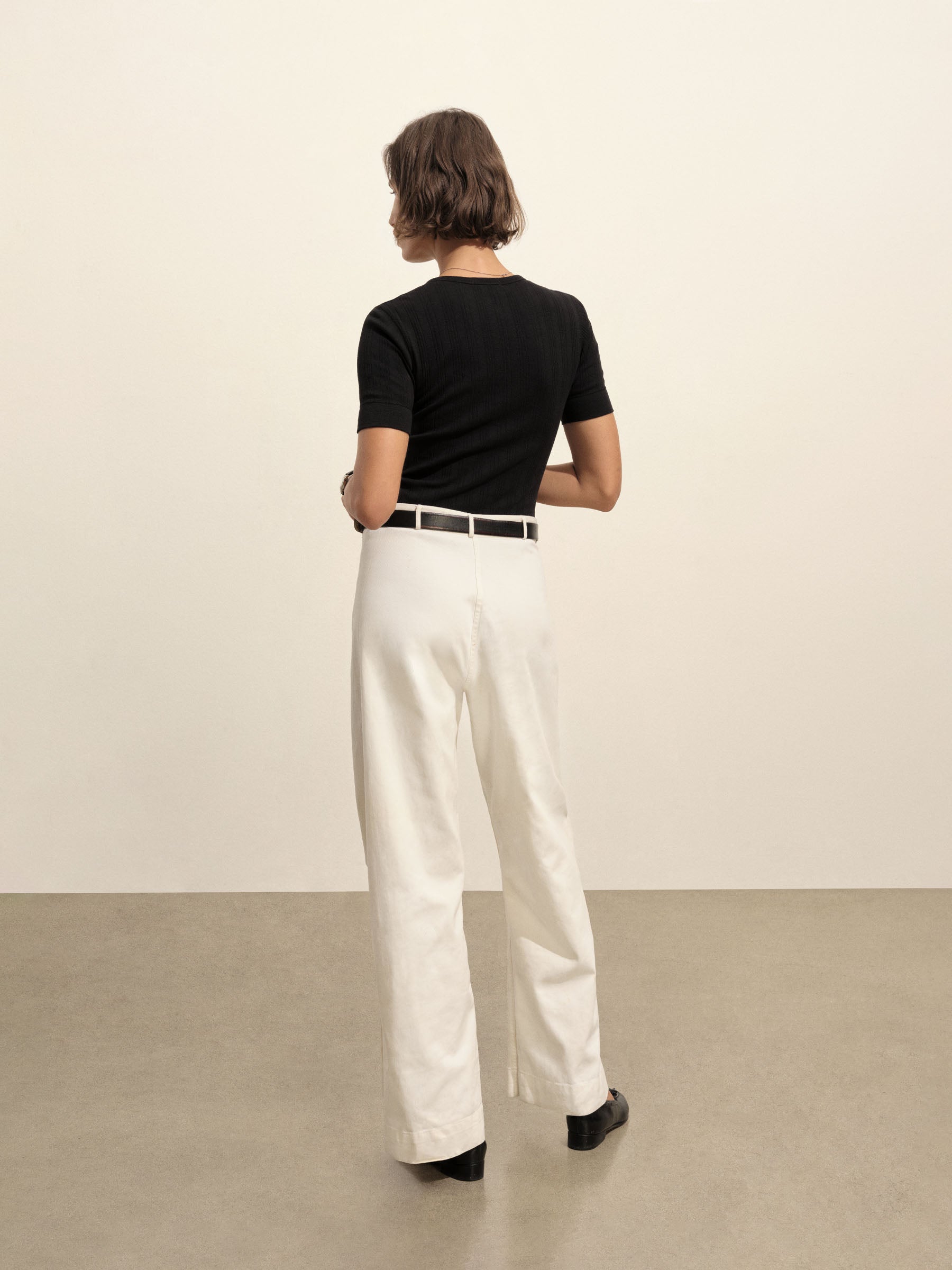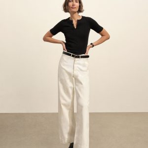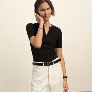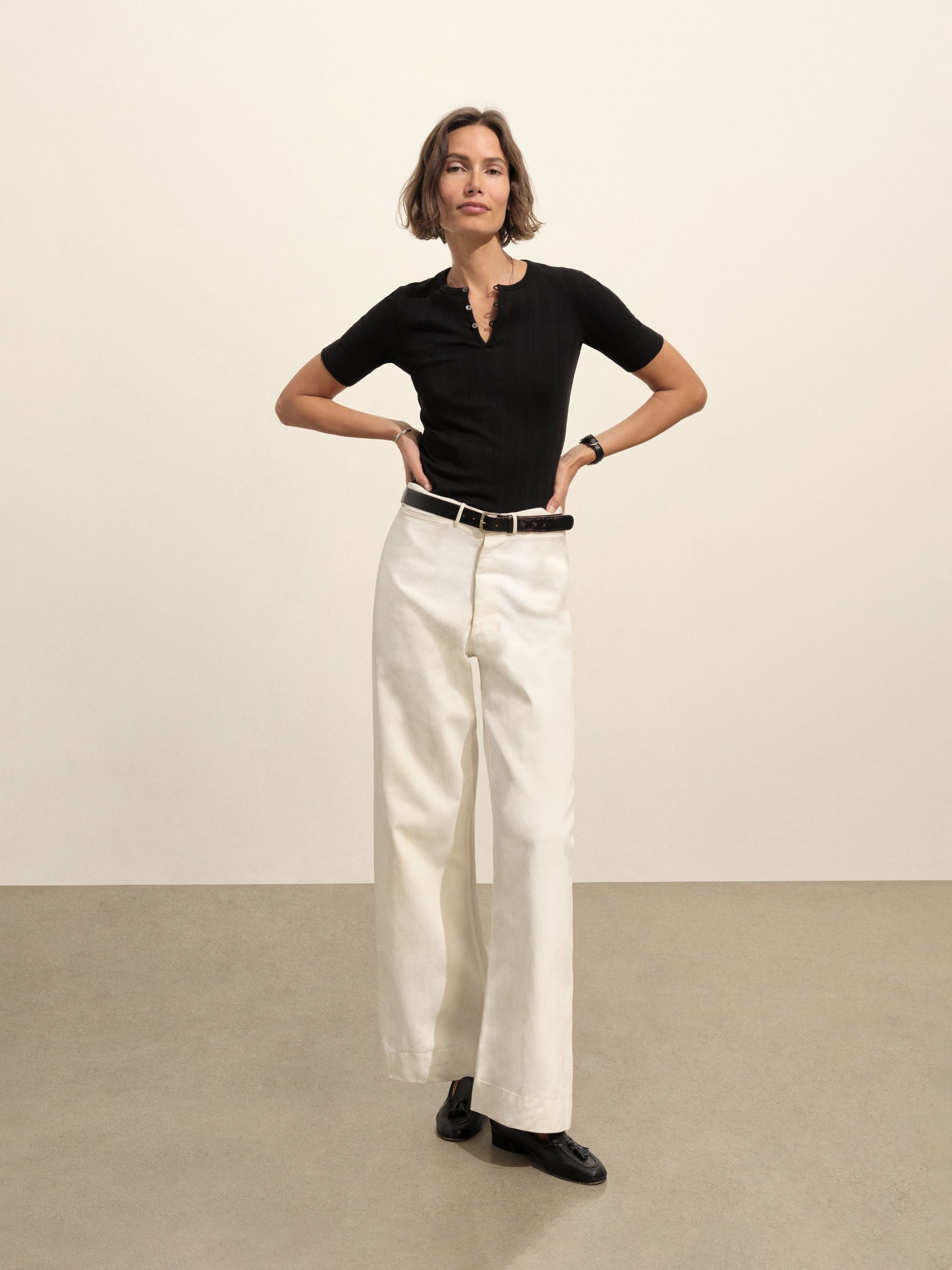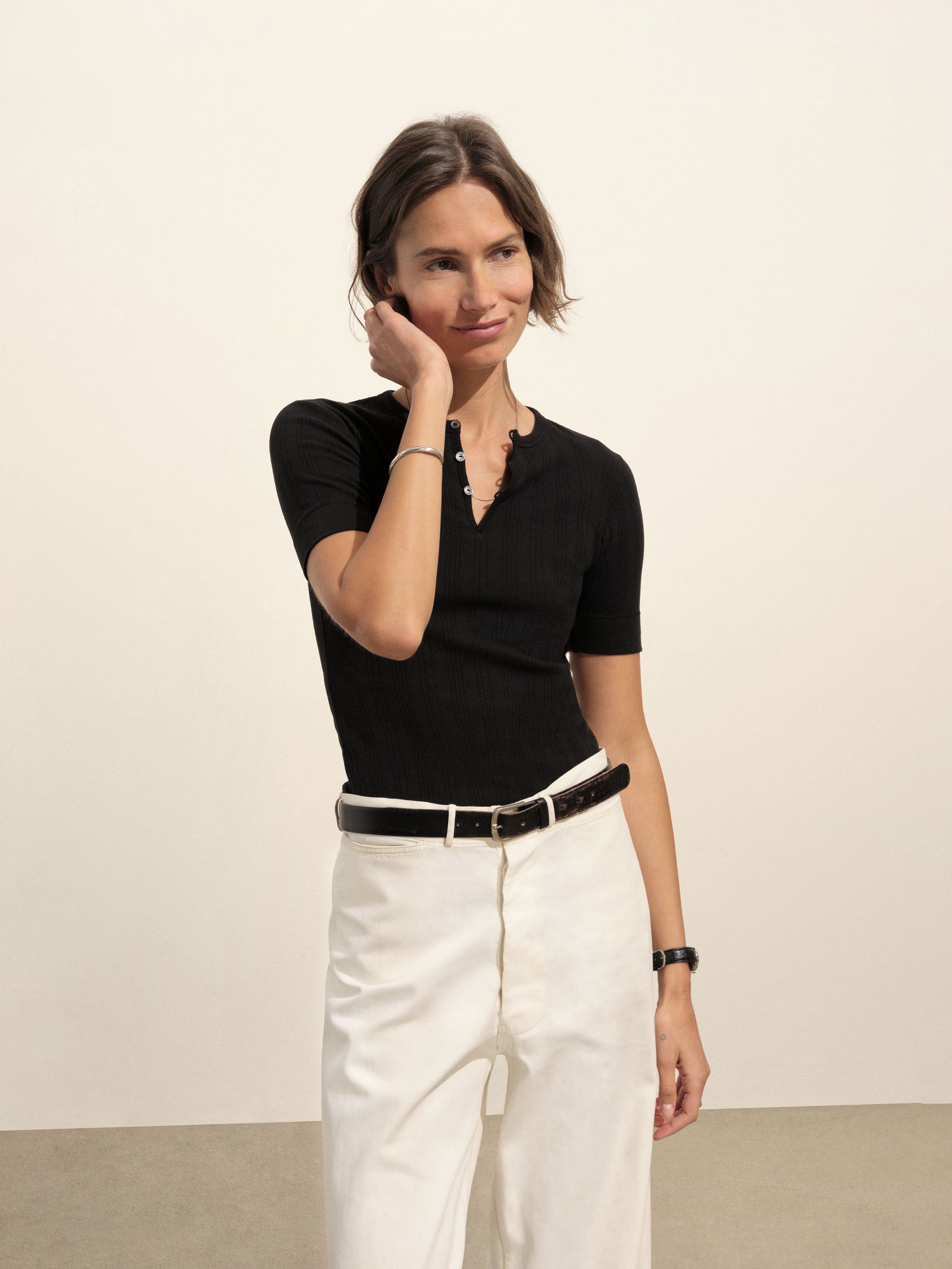 Military-inspired short sleeve henley, crafted from a superfine blend of new and recycled cotton with a subtle, textured rib. Featuring a three-button loop placket and sleeve cuffs. Finished with mother of pearl buttons and garment washed for a lived-in feel.