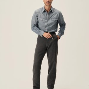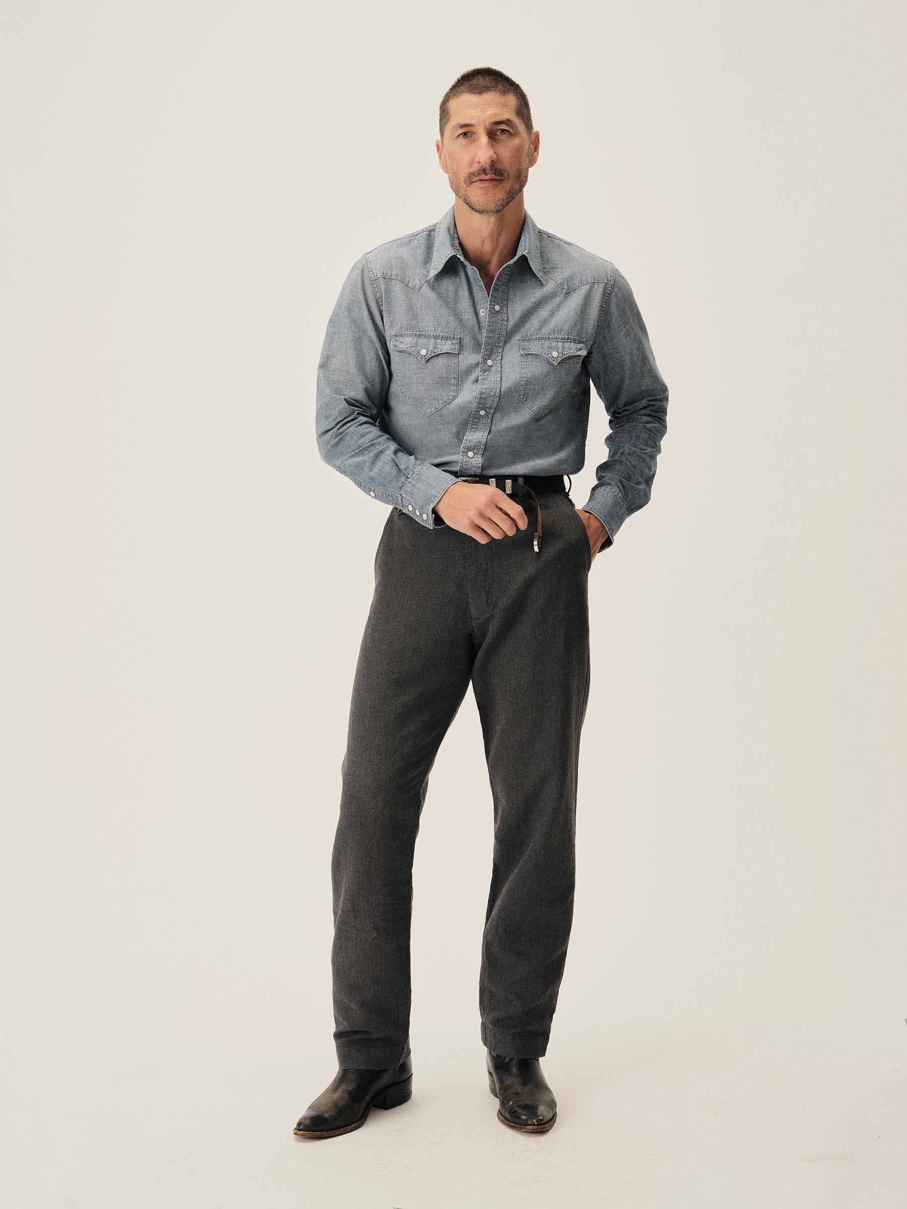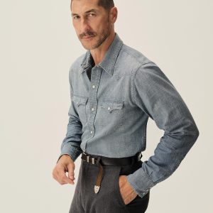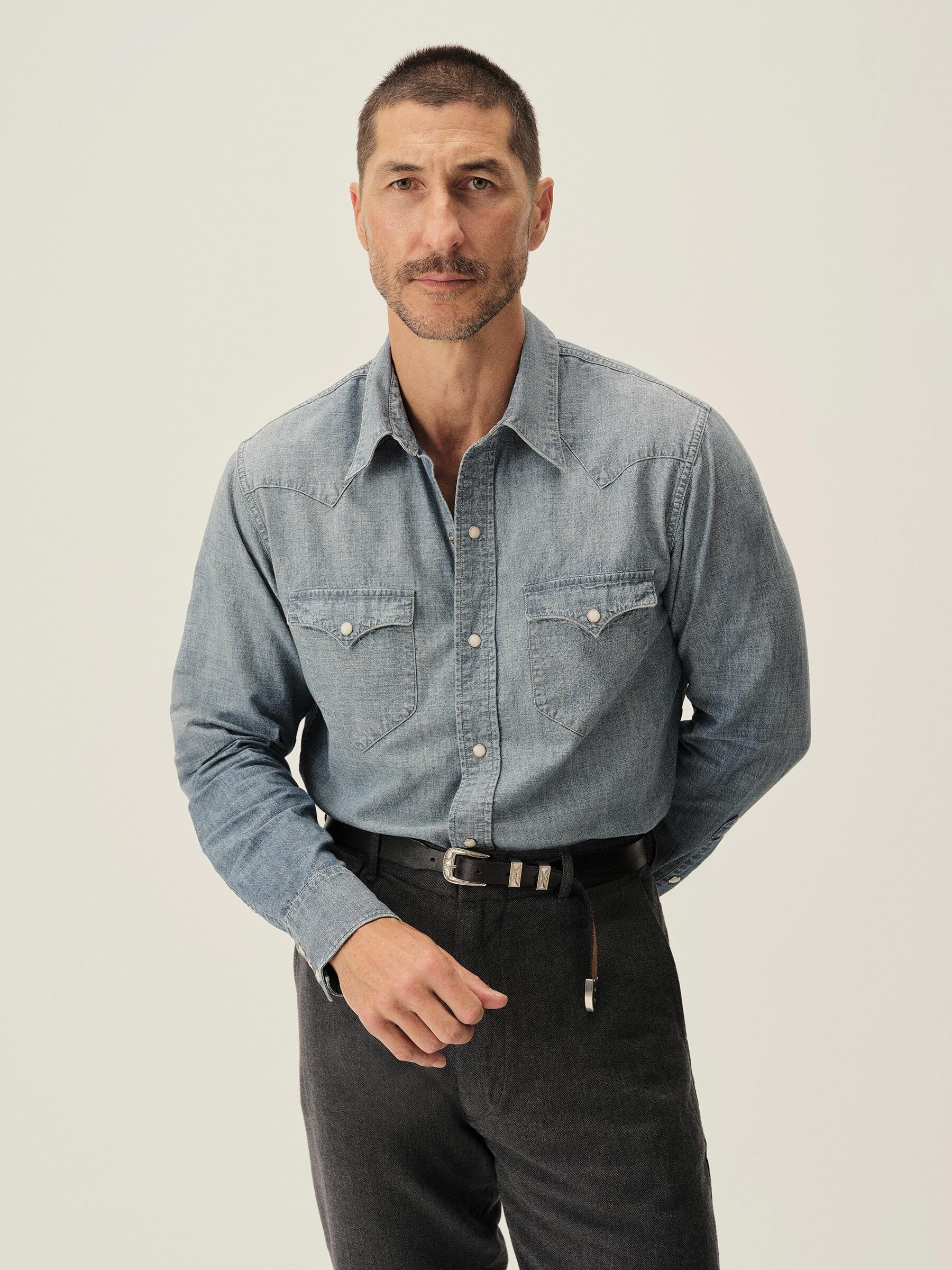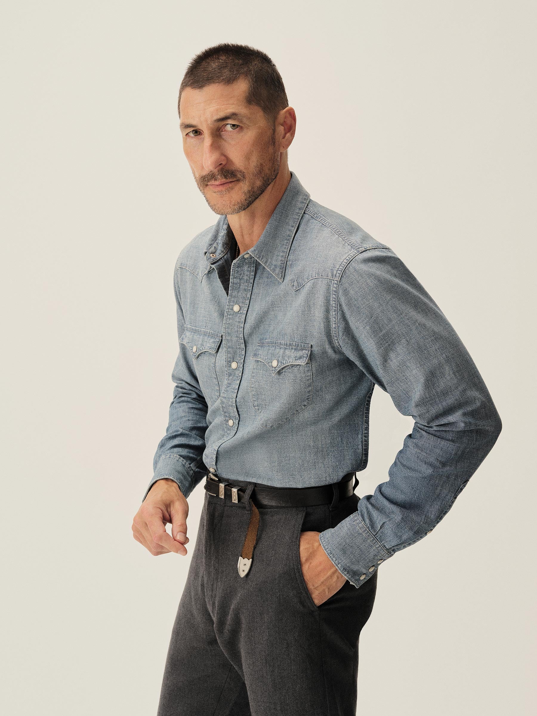 A classic western-style workshirt in a washed cotton chambray. The shirt has all cowboy details like pearl snap closures, curved western yoke, scalloped flap pockets, and three snaps along the cuffs. The blue chambray cotton has been washed for a lived-in feel.