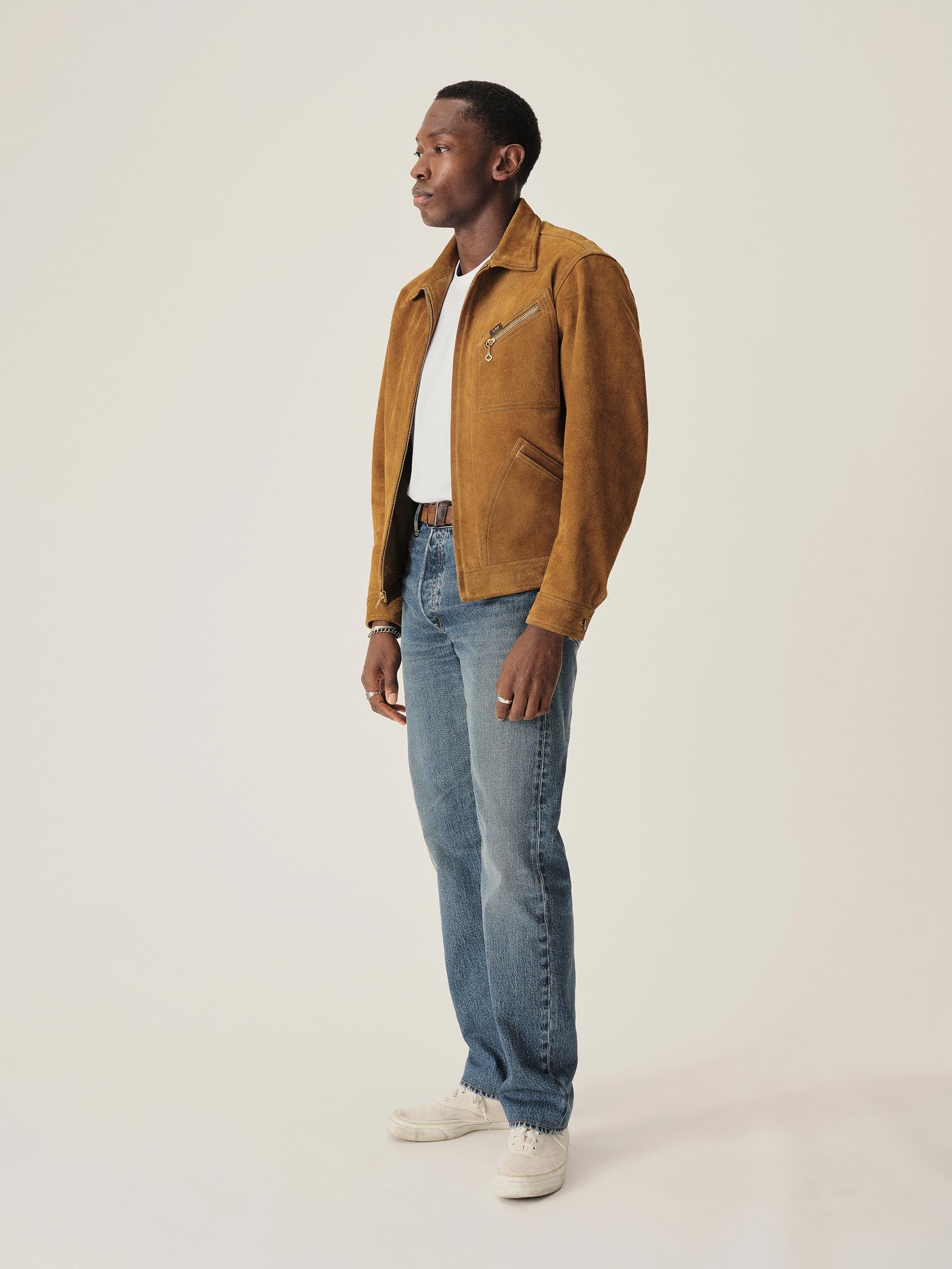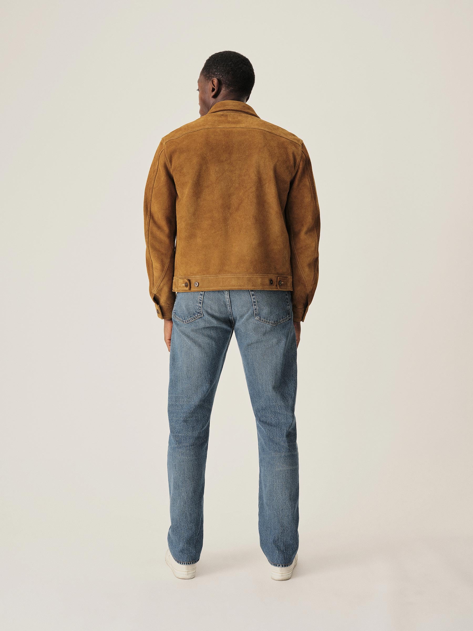 The 91-B is a distinctly Lee design with two D patch pockets on the waist, a full zip front, and a zippered chest pocket. We reimagined the design in a rugged full-grain cowhide suede. The fit is cropped with a boxy fit but can be adjusted with side buttoned tabs.