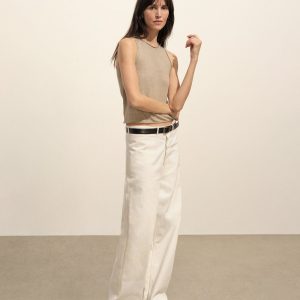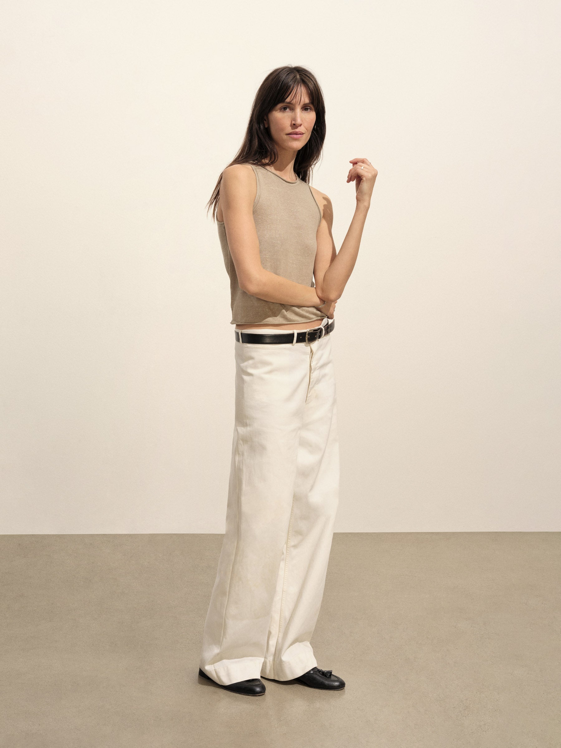 Oversized rollneck sweater-tank knit from textured linen, featuring a high neckline and a concealed thread-chain and snaps at each shoulder to hold bra straps in place. Garment washed for a soft, textured feel.