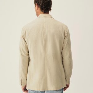 Tailored 3-roll-2 button blazer inspired by timeless vintage suiting. This 5 oz cotton seersucker has a rippled texture that wicks moisture and maintains airflow making it ideal for warmer climates. Details include two patch pockets, two internal welt pockets, and a notched lapel. We left it unlined and omitted the back vent and cuff buttons for a casual, streamlined look. Constructed with hand-linked seams and garment washed with enzymes and softener for a lived-in feel.