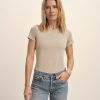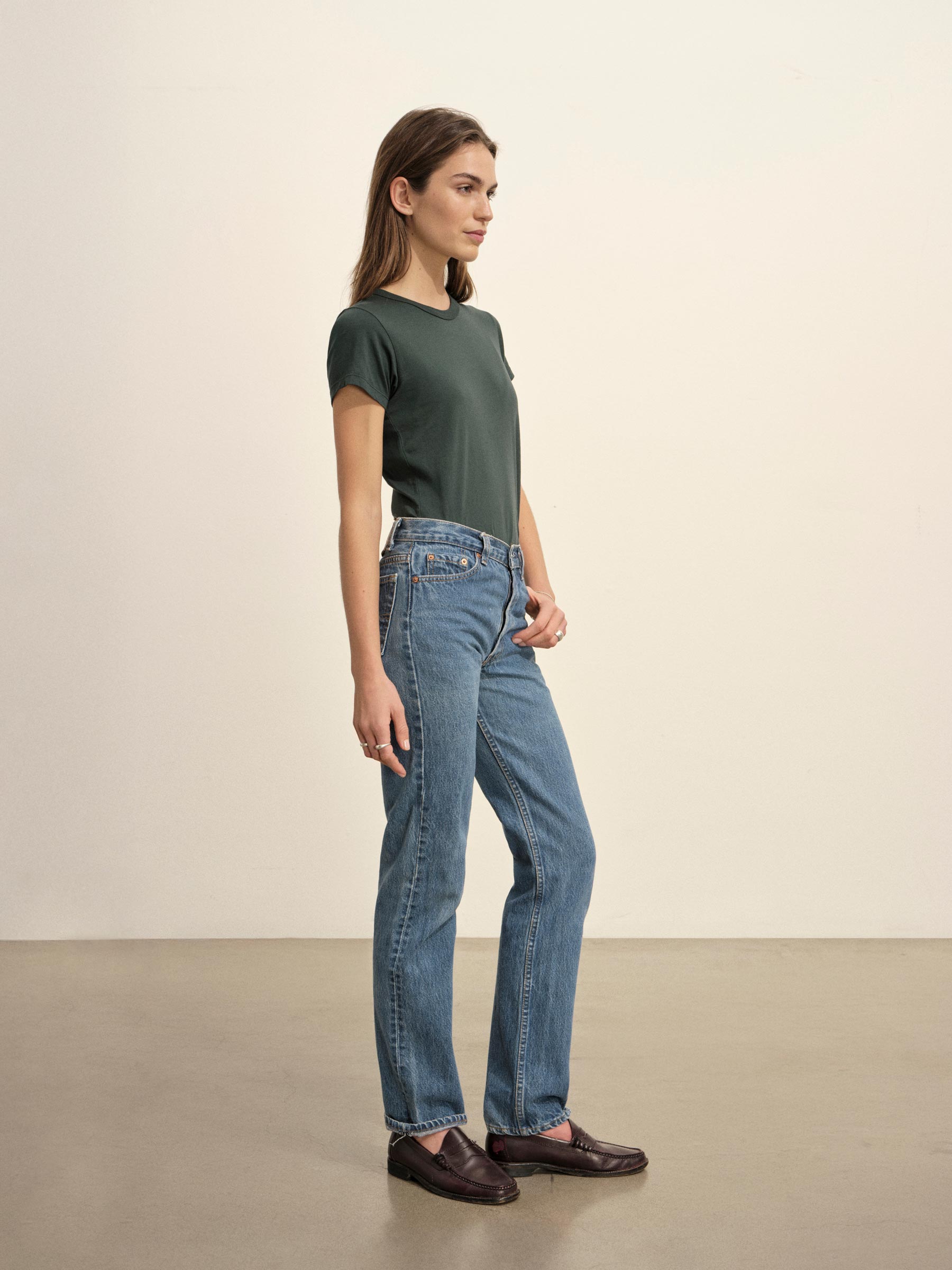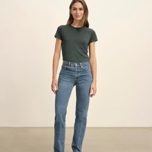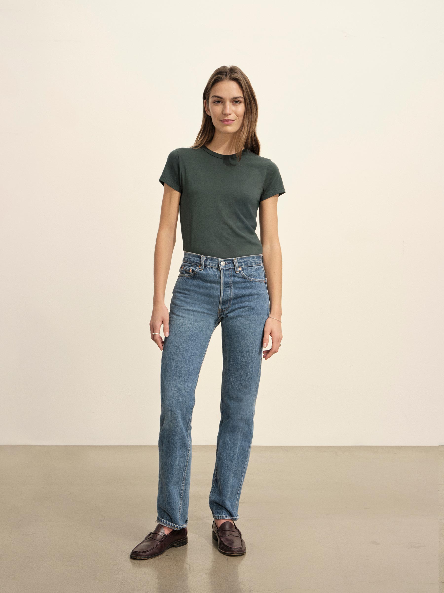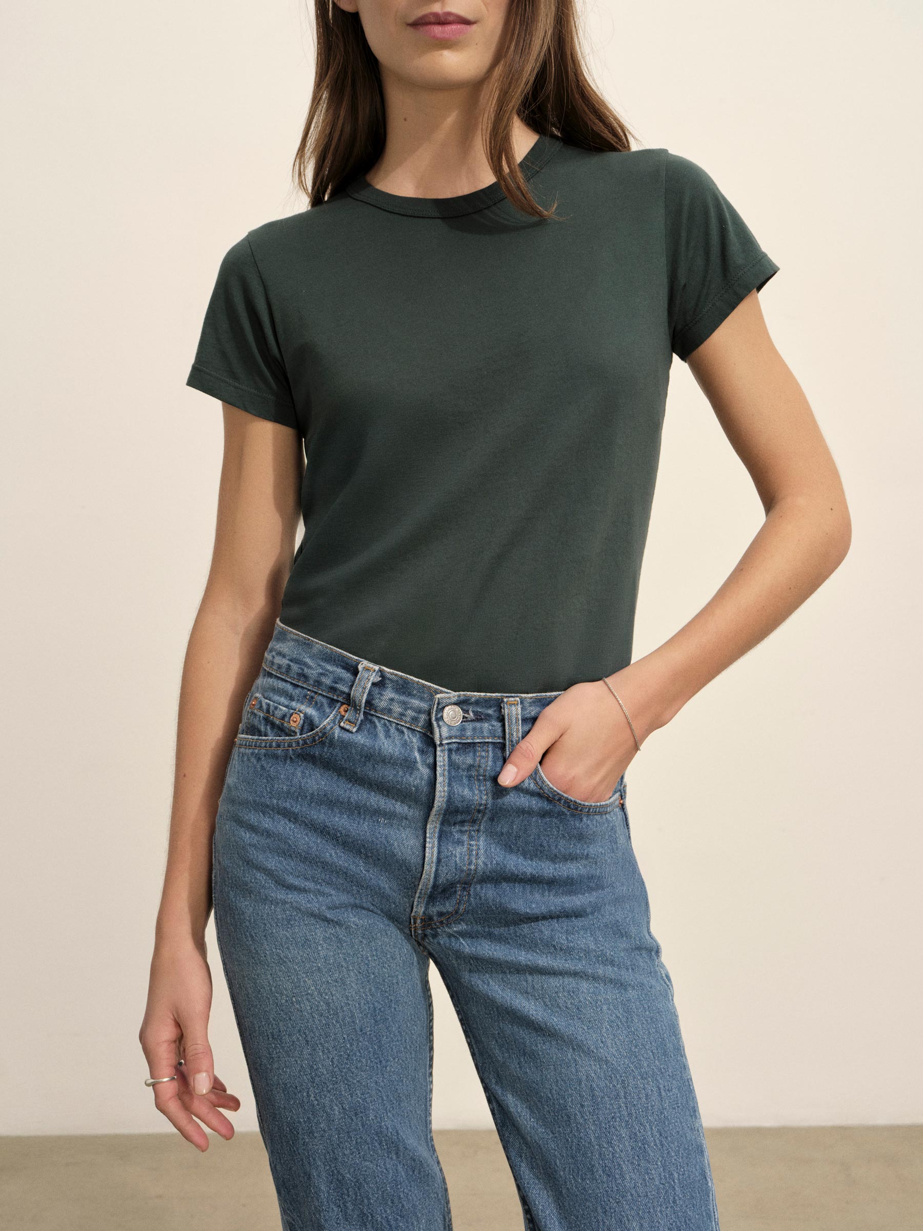 Slim fit short sleeve crewneck tee with a straight hem in 120 GSM jersey, knit from long-staple Supima cotton. Constructed with a durable rib stitch collar and double-needle cover stitch hem. Garment washed with softener for a lived-in feel.