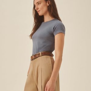 Slim fit short sleeve crewneck tee with a straight hem in 120 GSM jersey, knit from long-staple Supima cotton. Constructed with a durable rib stitch collar and double-needle cover stitch hem. Garment washed with softener for a lived-in feel.