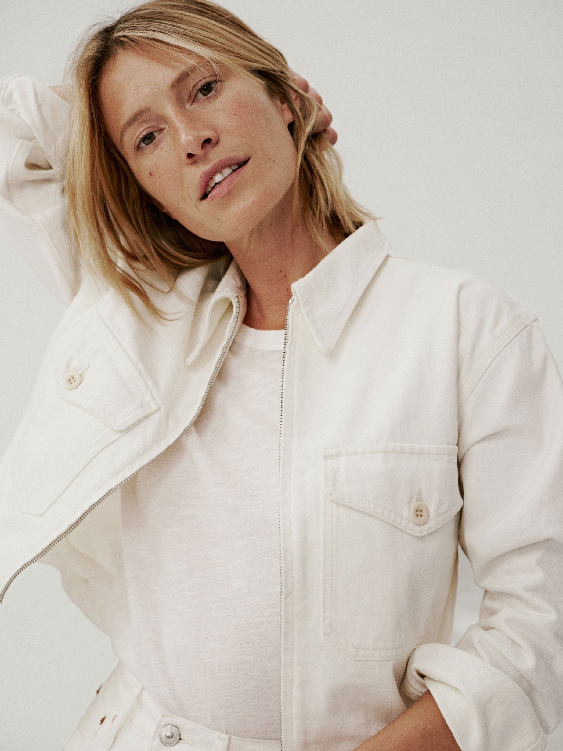 Relaxed utility jacket inspired by vintage mechanic uniforms. Cut from subtly structured 11.4 oz. cotton twill with all of the character of classic denim and a touch of stretch for comfort. Details include a zipper front, chest pockets, and button-through cuffs. Back tabs can be adjusted for a more fitted waist and extra blouson. Garment dyed and washed for a lived-in feel. Pair with the Rider Pant to complete the look.
