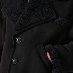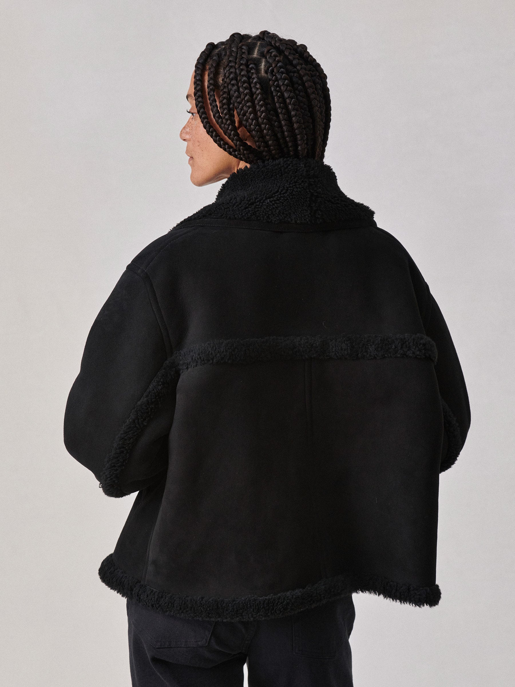 Relaxed shearling jacket in a 25” length. Hand-cut from vegetable tanned lambskin with a suede face and a semi-curl back. Authentic vintage details include easy armholes and sleeves for comfortable layering, horn buttons, and shearling-lined welt pockets. This hide has been vegetable tanned, top dyed, and tumbled for a lived-in look and feel.