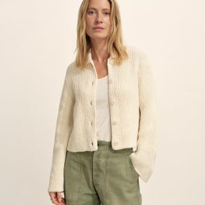Relaxed, rib-stitched collared cardigan made from a lofty 5 guage cotton. Garment washed for a lived in, vintage feel and completed with corozo buttons and an easy, slightly laid back silhouette.