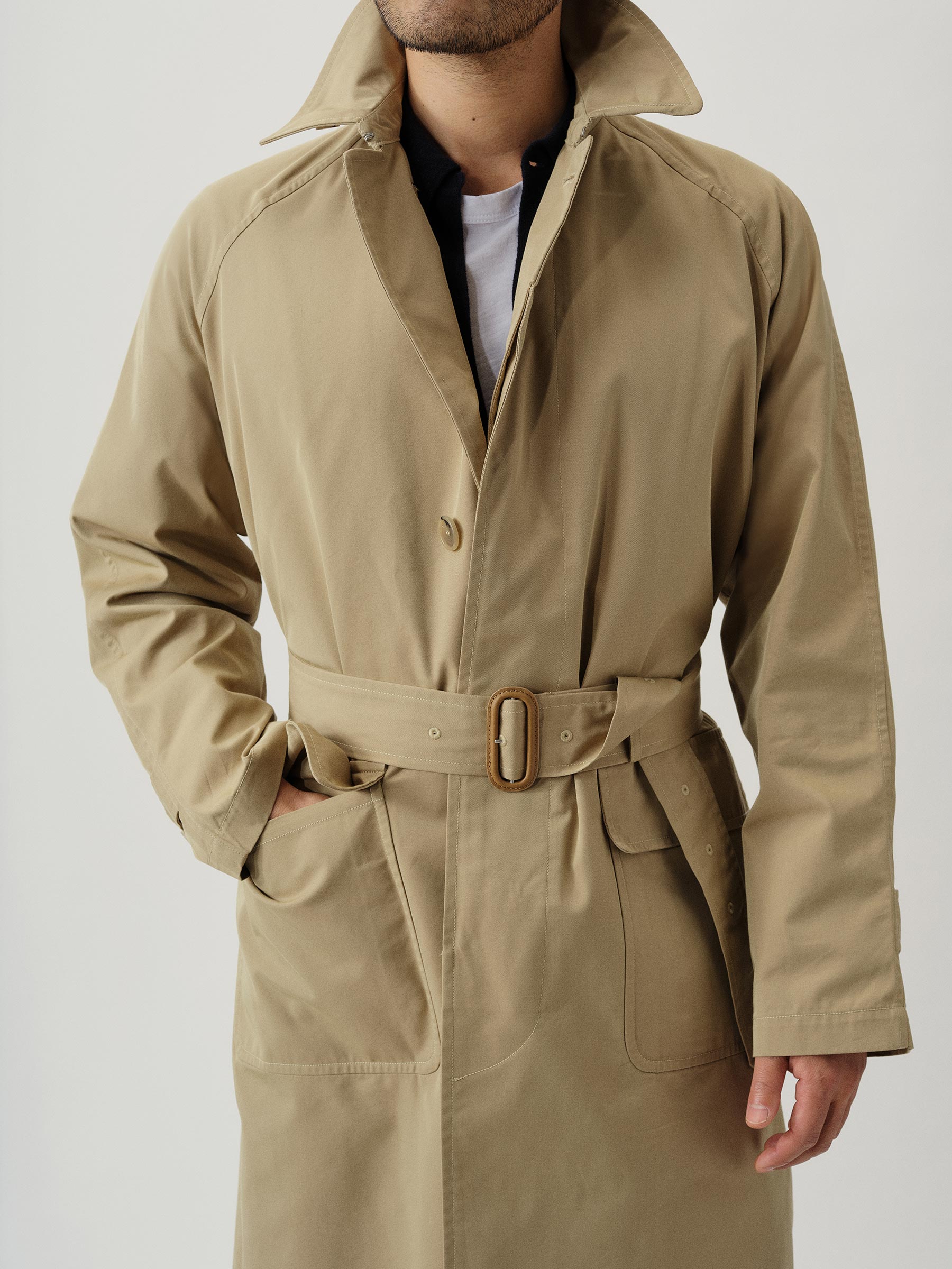 Relaxed, vintage-inspired trench coat cut from 5.7 oz yarn-dyed cotton/poly twill weather cloth with a DWR finish. Features patch and flap pockets, raglan sleeves, buttoned tab cuffs and throat, and a deep back vent. Includes a removable belt with leather buckle for cinching the waist.