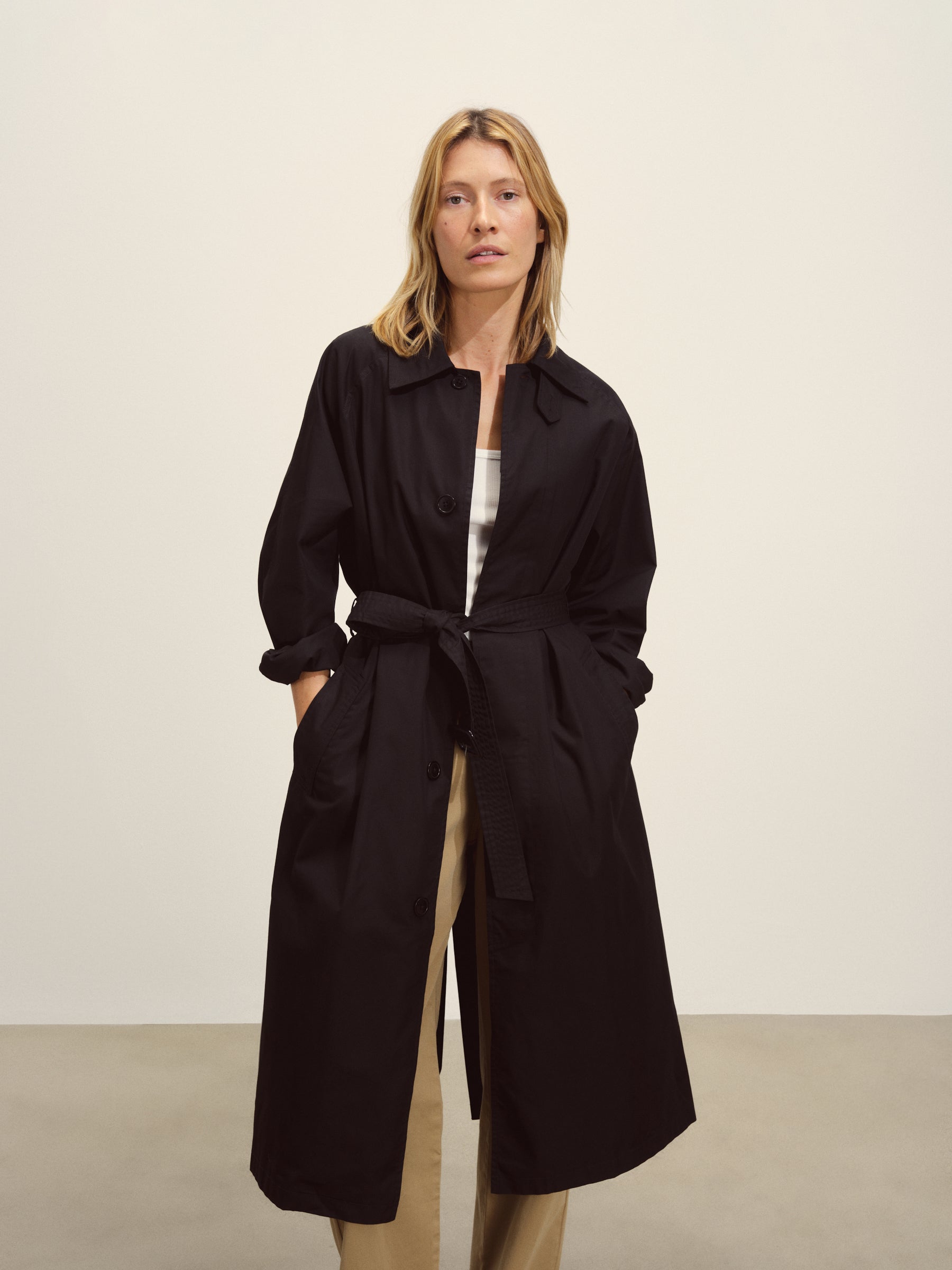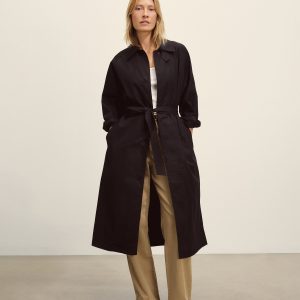 Relaxed, vintage-inspired trench coat cut from 5.7 oz. yarn-dyed cotton/poly twill weather cloth with a DWR finish. Features welt pockets, raglan sleeves, and a deep back vent. Details include a collar tab, button and tab cuffs, and a removable belt with leather buckle for cinching the waist. Size down for a more fitted silhouette.