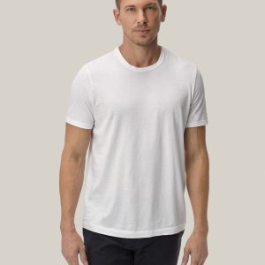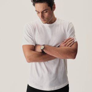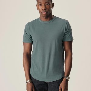 Cut from a midweight 200 GSM USA-grown cotton, developed, milled, and sewn at BM Knitting Mills in Mohnton, PA. This 90s-inspired boxy crewneck tee has a straight hemline, longer sleeves that hit lower on the bicep, and a wide ribbed collar. Bound neck and screen-printed label for comfort, constructed with a split-needle cover stitch at shoulders and armholes. Double-washed for a soft, smooth texture and consistent fit.