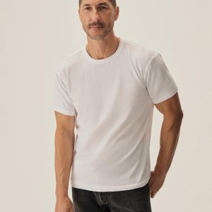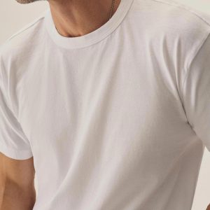 Two classic-fit, short-sleeve crewneck tees made from midweight, American-grown, ring-spun cotton yarn. The tubular-knit construction eliminates side seams, offering a clean drape that naturally molds to the body. The subtly textured 160 GSM fabric is knit at BM Knitting Mills in Mohnton, PA, and sewn in Los Angeles.