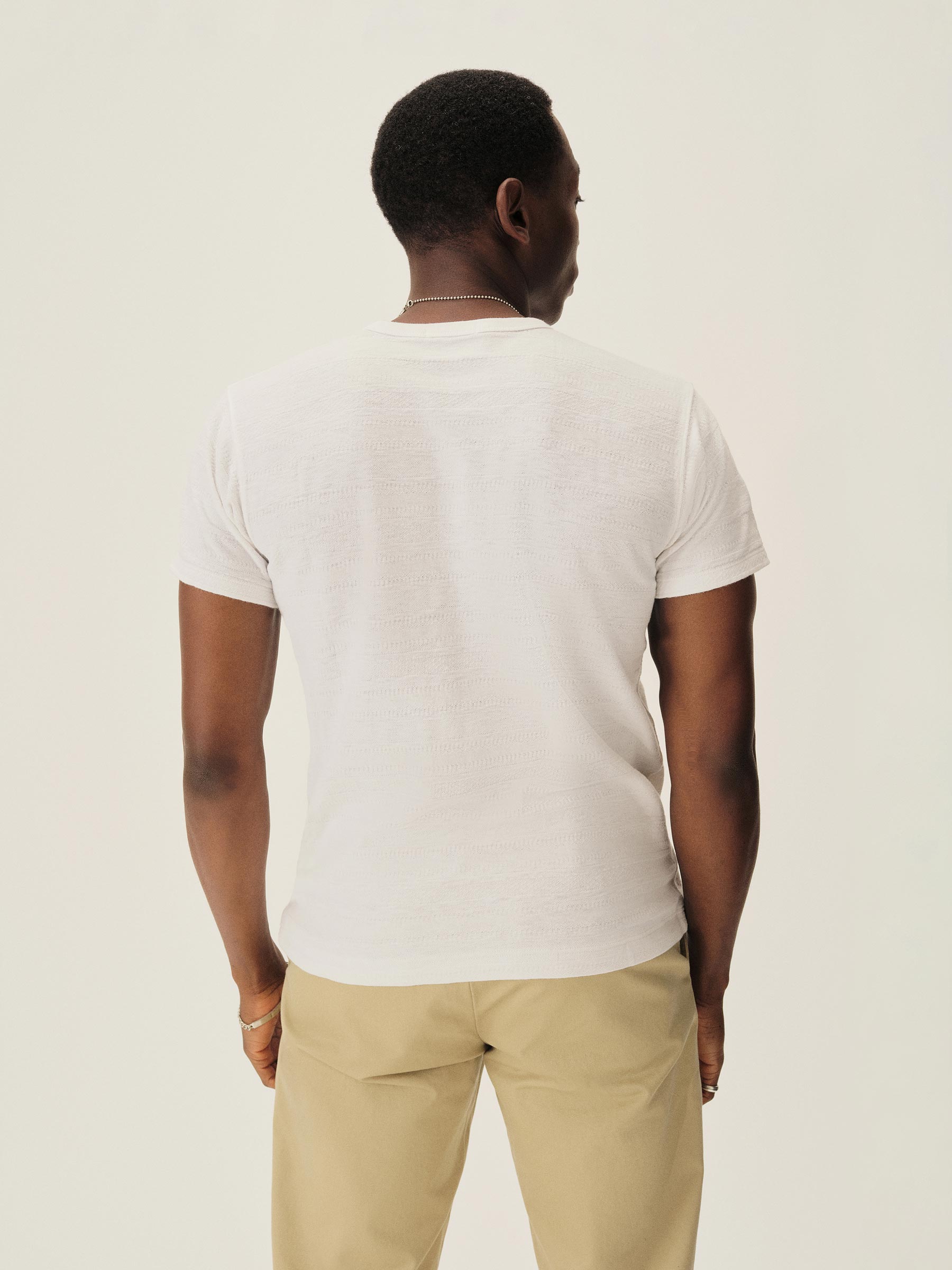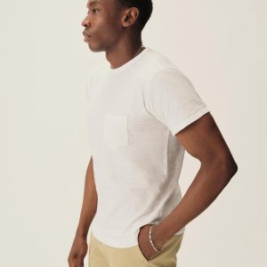 Classic fit short sleeve crewneck tee with a straight hem and patch chest pocket. Cut from a midweight cotton with tonal jacquard patterning. Garment washed for a lived-in feel.