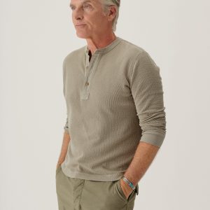Classic fit thermal long sleeve henley with a straight hem. This 250 GSM French rib cotton double knit features a waffle-knit face and a smooth jersey back. Details include a woven three-button placket and corozo buttons. Constructed with ribbed cuffs and flat-lock stitching throughout for improved comfort and durability. Garment washed with enzymes and softener for a lived-in feel.