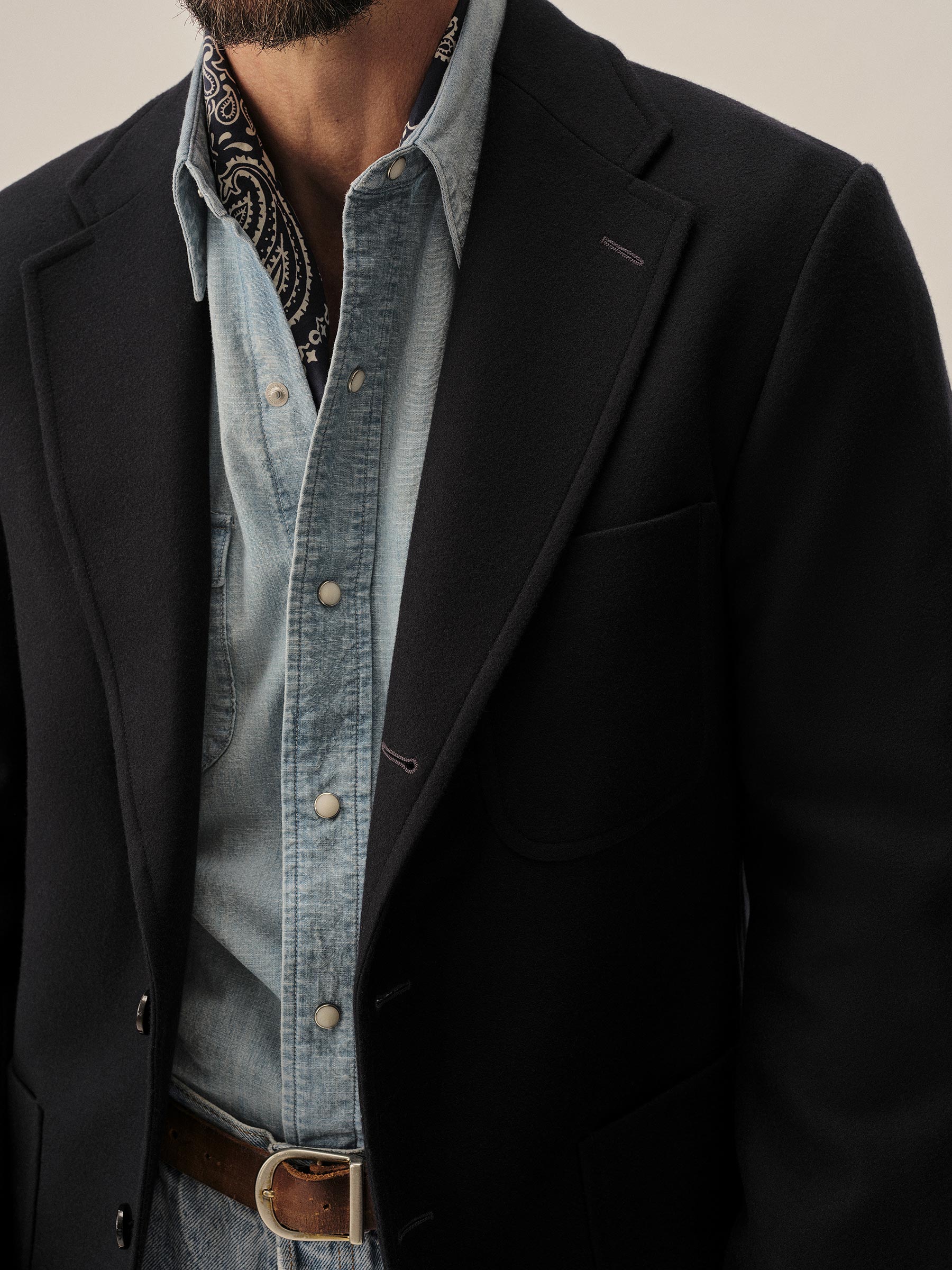 An Ivy-inspired American blazer crafted from a blend of wool and cashmere. Designed with a 3-roll-2 button stance, open patch pockets, and a functional sleeve vent with two horn buttons. Cut with a center back seam and left unlined through the body for a relaxed, unstructured feel, while the sleeves are fully lined in viscose for smooth layering.