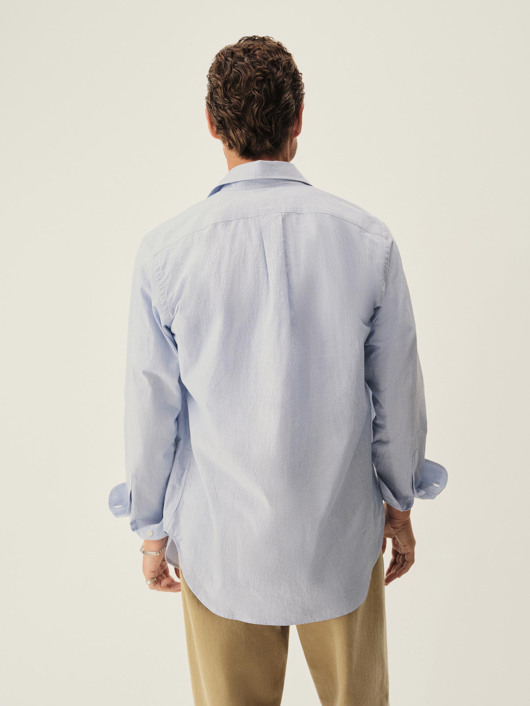 Slim fit long sleeve button-up cut from 4 oz. washed cotton. Details include a button placket, a single spade pocket at the chest, and a box pleat at the back yoke. Constructed with single needle topstitch detailing with double needle stitching at the collar and cuffs.